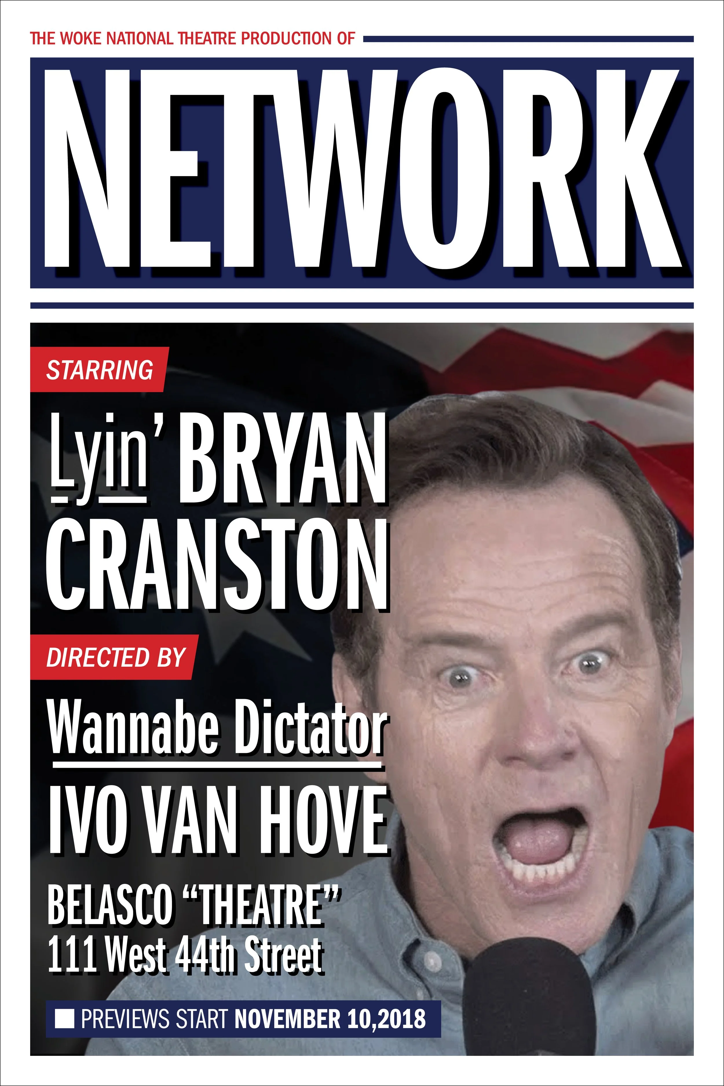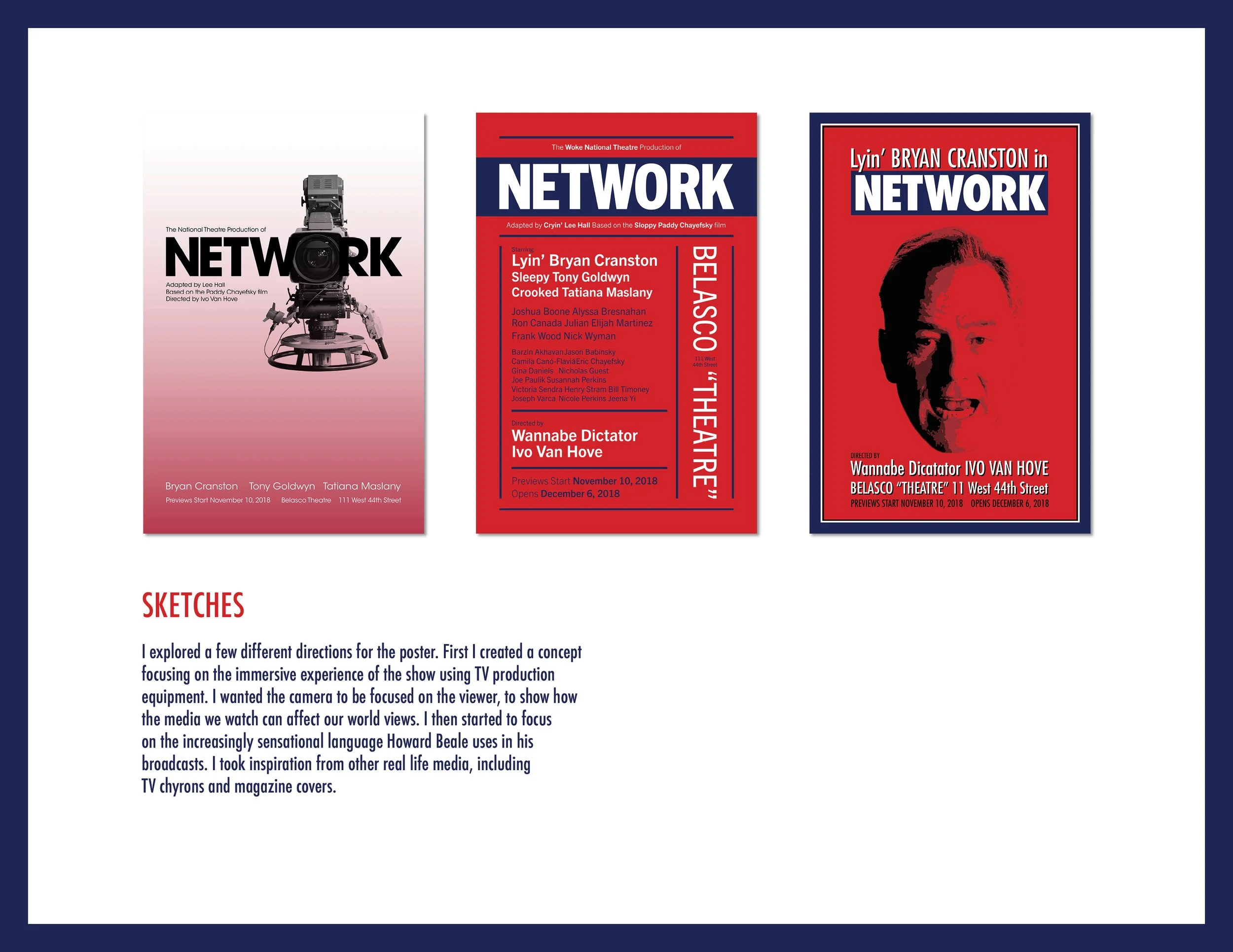 Lyin’ Bryan Cranston is mad as hell and he’s not gonna take it anymore! I designed two posters for the 2019 production of Network on Broadway, starring Bryan Cranston, for a continuing education class in Typography at SVA. I focused on the sensationalized media theme of the play, and created posters inspired by tabloid magazines and propaganda posters. I also added phrases I had seen used by politicians or on news chyrons to add some humor to the play information. This visual language can be applied to other branding for the show, like the Playbill.