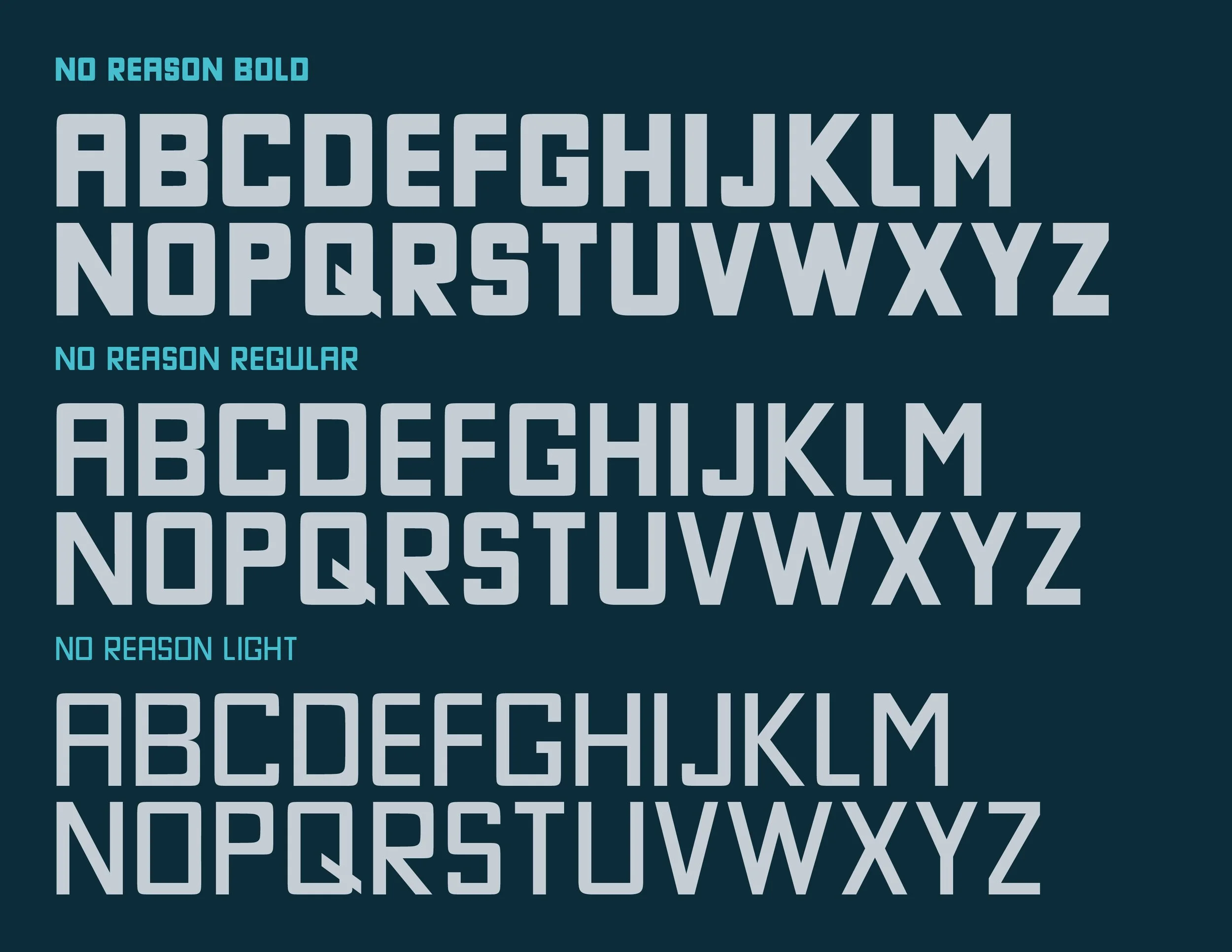 I had previously designed some custom type for a set of posters, having created more than half of the alphabet (14 characters in total). I then decided to finish it and make a working typeface, creating No Reason Regular. Later, I created additional weights of the typeface to make a family that could be used for a variety of display typography needs.
